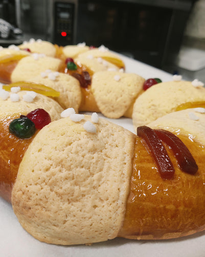 Our classic pan dulce for Día de Reyes: a soft, fragrant sweet dough infused with orange zest, topped with colorful dried fruits and sugar. Each rosca includes 4 muñequitos (plastic figurines) hidden inside.